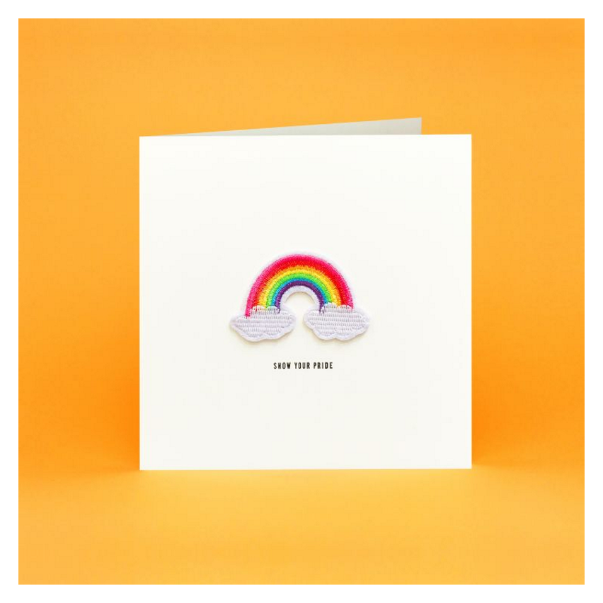 Lasst uns die Vielfalt feiern! Auf der Karte ist ein ablösbarer Regenbogen-Aufnäher, der auf Textilien aufgebügelt oder angenäht werden kann. Natürlich ist darunter noch einmal ein gedruckter Regenbogen versteckt.