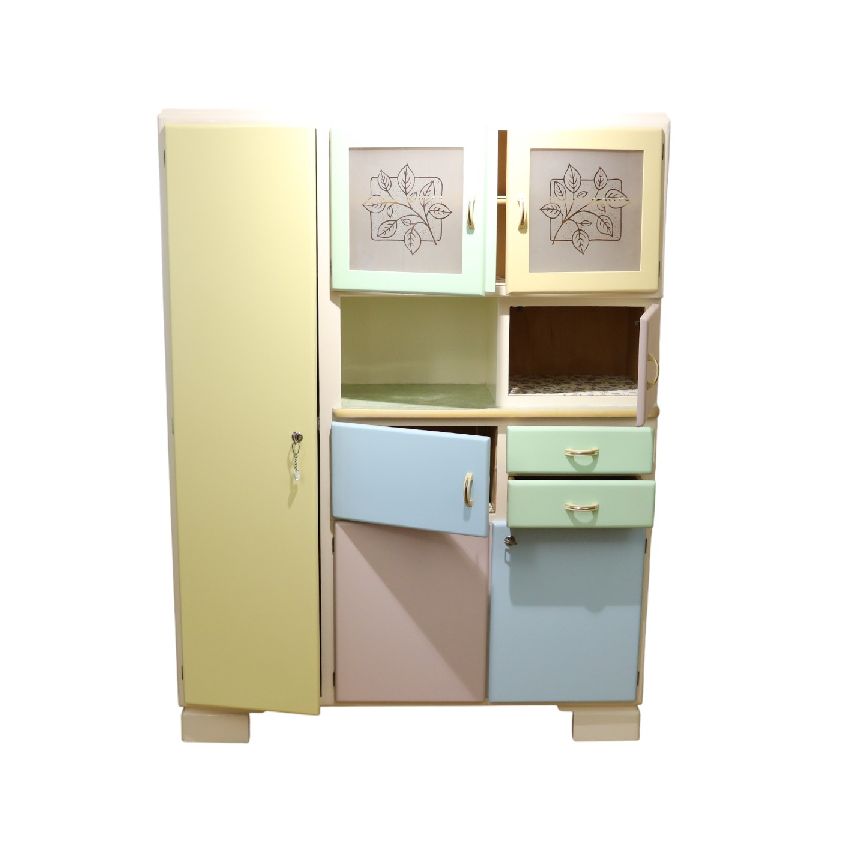Diese Kredenz (Küchenschrank) hat ein charmantes, retro-inspiriertes Design mit einer Kombination aus sanften Pastellfarben — darunter Gelb, Mintgrün, Hellblau und Beige.