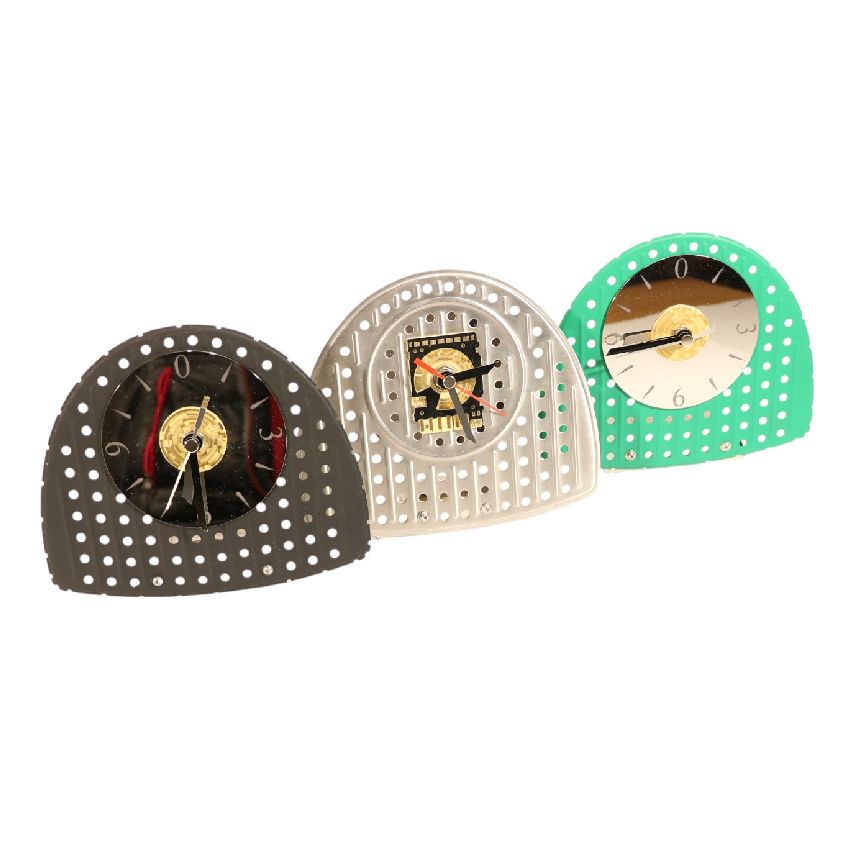 Große Tischuhr aus recyceltem Espressoblech mit farbigem Vordergrund.