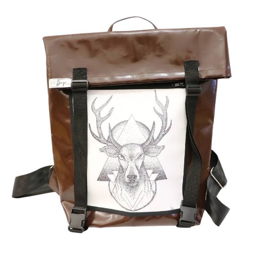 Großer Rucksack mit Hirsch-Motiv Stylischer Rucksack aus robuster Werbeplane mit kunstvoller Hirschzeichnung auf der Vorderseite. Praktisch: Ein Außenfach mit Reißverschluss direkt über dem Motiv sowie ein zusätzliches Innenfach mit Zipper für sichere Aufbewahrung. Wetterfest, geräumig und nachhaltig – ideal für Alltag und Abenteuer.