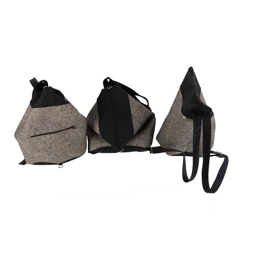 Moderner, leichter Rucksack aus lichtgrauem Mühlviertler Melefilz mit anthrazitfarbenen Elementen. Innentaschen aus Filz und Leder; verstellbare, verstärkte Filzträger, Reißverschluss und Karabiner.