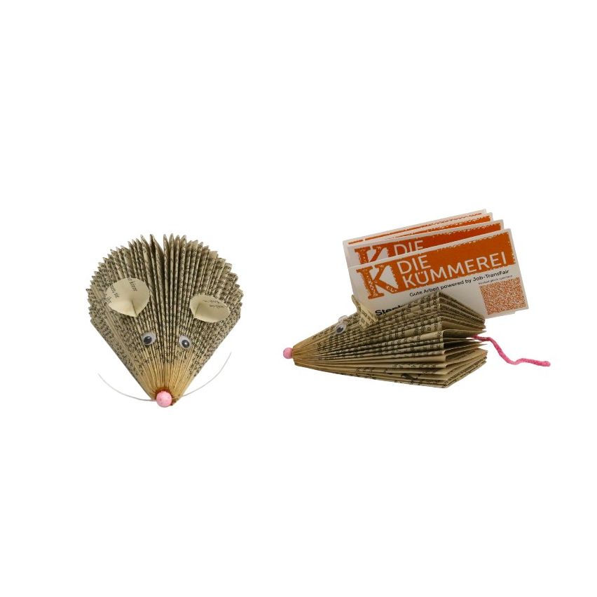 Der Visitenkartenhalter Faltbuchmaus klein ist ein liebevoll gestalteter Hingucker für Schreibtisch oder Verkaufstheke. Handgefertigt aus gefalteten Buchseiten, kombiniert er Funktionalität mit charmantem Design.